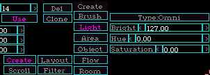 Create one in the middle of a wall somewhere. Lights are yellow in the 2d window so that you can easily spot them. Now, if after creating the wedge wall light you can't see anything in the 3d window do not worry. The wedge wall light is a one sided object, and is transparent from the wrong angle. Rotate it around and place it up against a wall near the ceiling. After lighting you will notice that this light emits a cone of light down. Place some more lights about the room as you see fit. If you highlight the wedge wall light and then go to the object hierachy, it will appear at the position of the wedge wall light, which makes it easy to choose a similar type object.